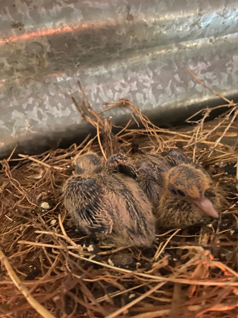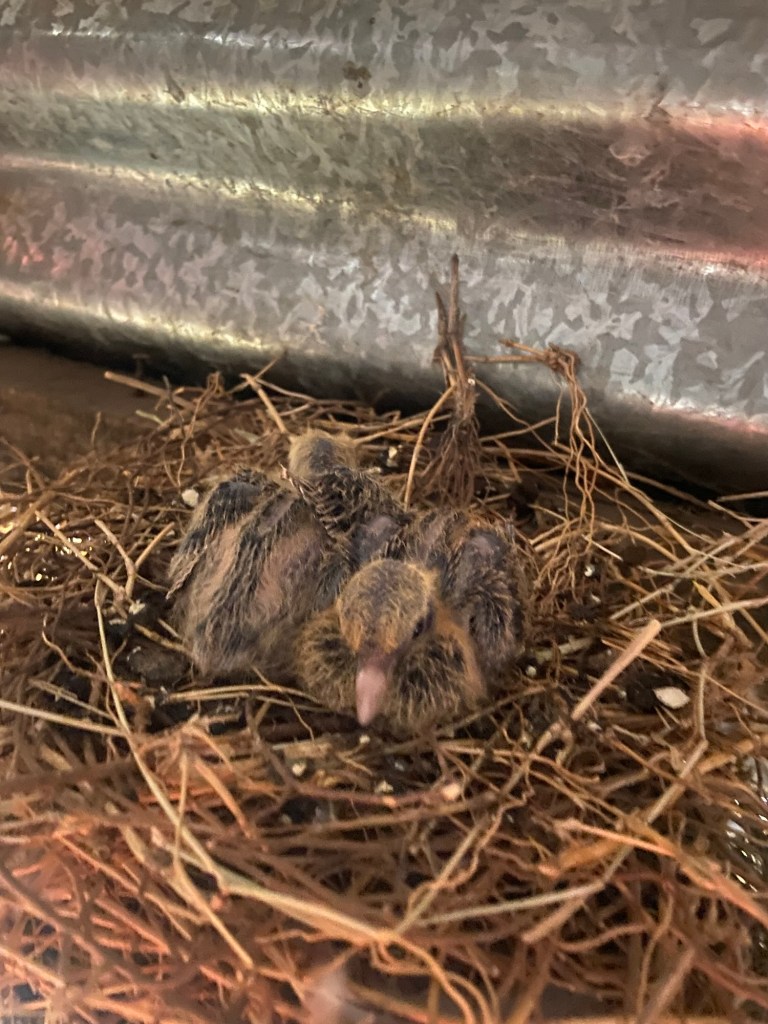 Zwei Wochen später waren die Taubenküken geschlüpft und werden nun von den Eltern liebevoll umhegt und versorgt.