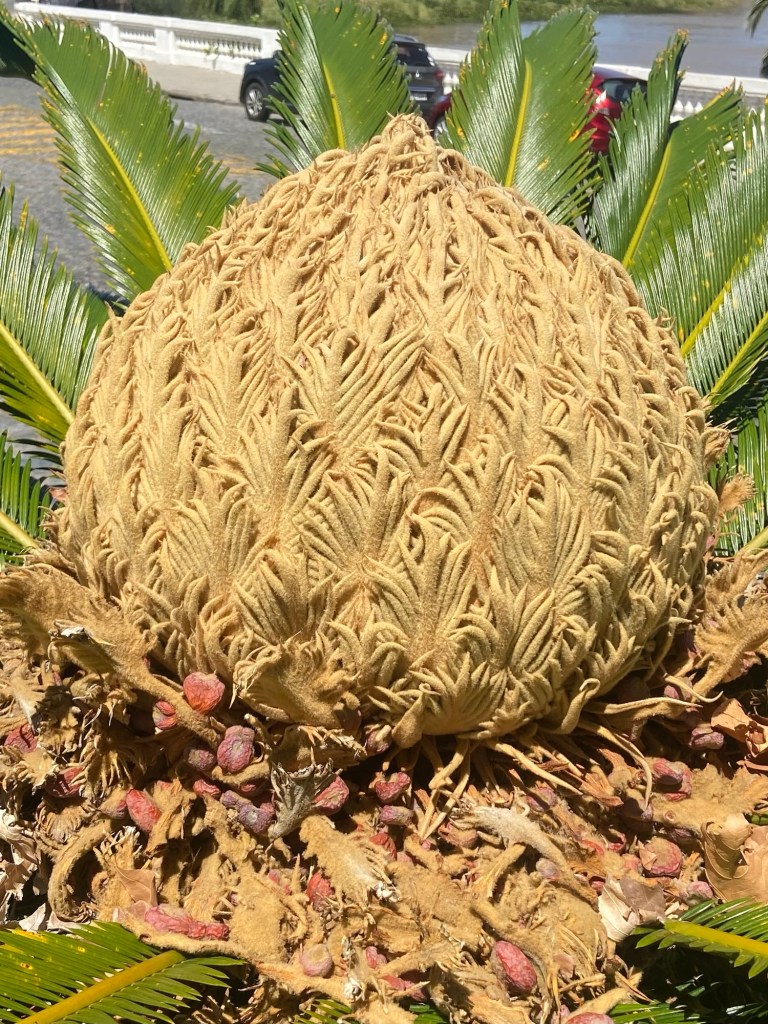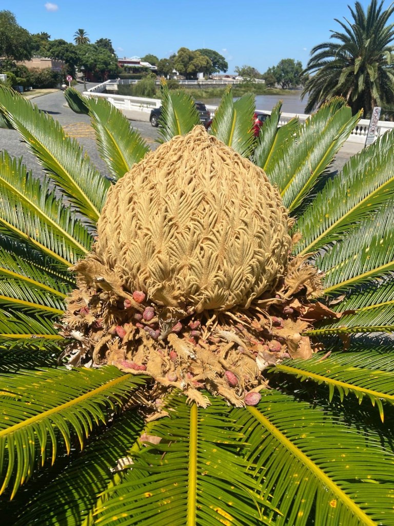 Eine ganz seltene Erscheinung ist die Blüte einer Sagopalme. Wunderschön anzusehen mit ihren filigranen Blättchen, ein absoluter Hingucker und ein Wunderwerk der Natur. Ich habe sie ganz zufällig in Colonia entdeckt. Diese Pflanze steht schon seit Ewigkeiten in einer Rabatte in der Altstadt, mit Blick auf den Rio de la Plata. Das Wasser des Flusses war heute schmutzig braun und so ließ ich den Blick über die gegenüberliegende Seite gleiten und entdeckte die herrliche Blüte, von der ich zuerst gar nicht wusste, dass es eine war. Unsere Pflanzen-App brachte dann die Erklärung.