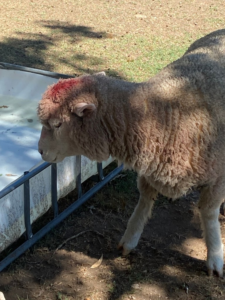 Alle hoffentlich trächtigen Schafe bekamen einen roten Punkt auf den Kopf, damit wir sie in fünf Monaten kurz vor dem Geburtstermin separieren können.