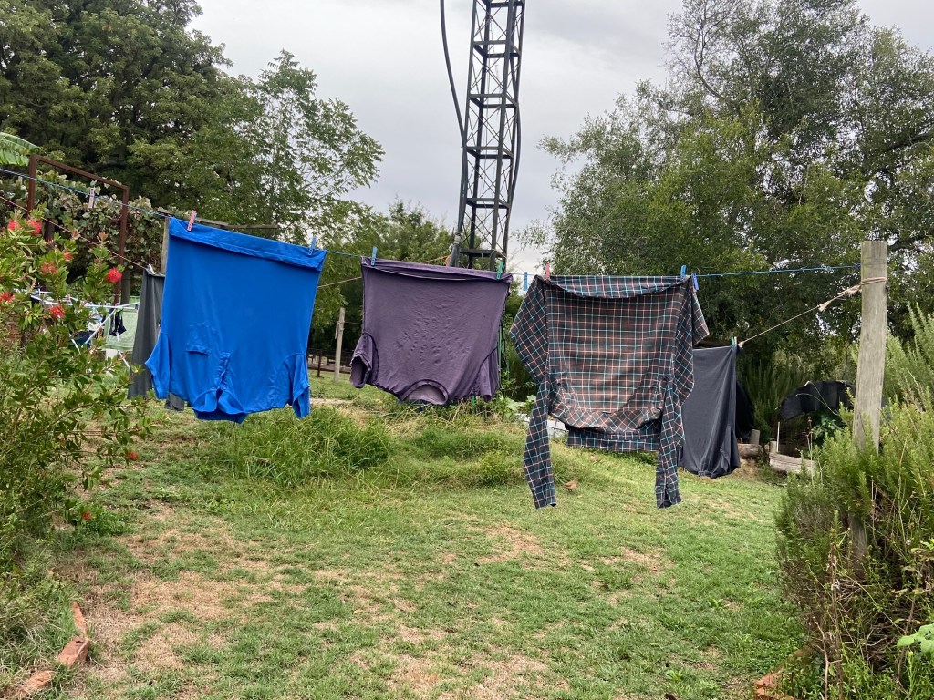 Weil für heute strahlender Sonnenschein vorhergesagt war, habe ich gestern noch die Schmutzwäsche vom Samstag in die Waschmaschine gestopft und am Abend raus an die Leine gehängt.
