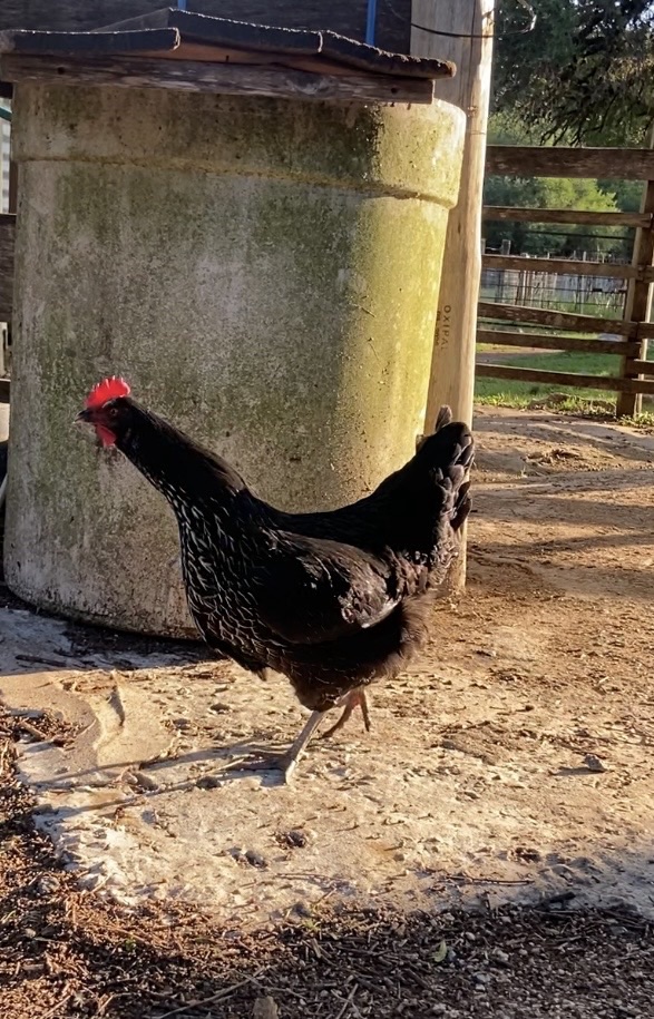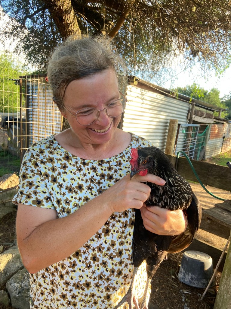 Das ist Gerda, eine unserer Junghühner. Sie ist zahm und lässt sich gerne hochheben und knuddeln.